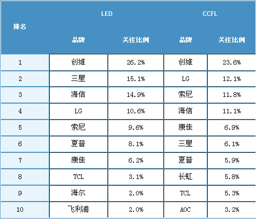 2010年5月,在中國LED背光液晶電視市場三星超越了海信成為關注亞軍,5個國外品牌在中國LED背光液晶電視市場的累計關注比例達到45.2%。此前阻礙國外品牌LED背光液晶電視發展的主要因素即為相對高昂的價格,而目前眾多國外品牌也已經加入到價格戰中來,通過直接降價或提供豐厚贈品的方式來搶奪市場份額。