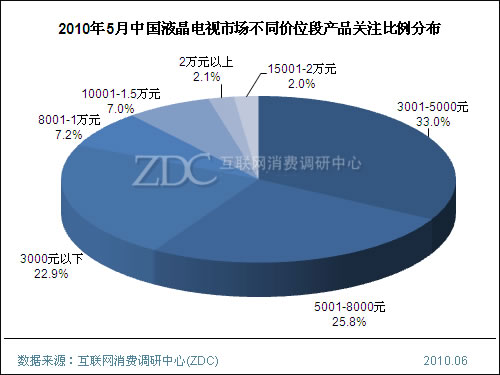5月,3001-5000元的液晶電視產品吸引了33%的消費者關注度,較上月升高了0.5%,而3000元以下的入門級液晶電視產品吸引了22.9%的消費者關注度,較上月提高了2.6%。而5001-8000元價位段的大中尺寸液晶電視的消費者關注比例較上月減少了4.1%。