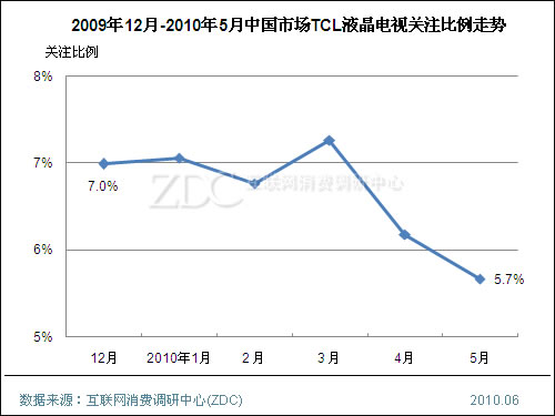 2009年,TCL在互聯網電視領域表現不俗,全年TCL液晶電視全球銷量為842萬臺,同比增長了101%。在2010年第一季度TCL的品牌關注比例走勢平穩,但4月開始其品牌關注比例有小幅下滑,5月已經下滑至5.7%,排名下滑兩位。