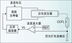 圖4給出了一個基于PZT的背景光轉換器的簡化功能圖。PZT由一個幅度正比于輸入電壓的諧振功率級驅動,它提供驅動熒光燈所需要的電壓增益。圍繞著誤差放大器形成了一個控制環,誤差放大器把平均熒光燈電流同參考信號(REF)相比較,以便于對熒光燈的光強度進行調節。控制電壓Vc驅動用來確定諧振功率級的運行頻率的壓控振蕩器(VCO)。