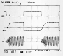 圖6顯示了基于壓電變壓器電路的脈沖調光波形。一個外部驅動信號(曲線4)用來給定工作周期和脈沖串的頻率,在本例中,在50%的工作周期脈沖串的頻率為100Hz。曲線1是反饋網絡的COMP引腳的信號,用來設定工作頻率。熒光燈電壓如曲線3所示。這些圖片是使用數字示波器得到,所以存在混迭現象。熒光燈的激發電壓幾乎檢測不到,因為燈已經是熱的并從前面的脈沖串周期運行過來。