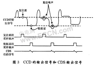 從圖3可以看出,當復位部脈沖是高電平的時候。CCD的輸出信號進行第1次采樣,采樣信號為復位電壓、復位失調電壓和復位噪聲;當數據部脈沖是高電平時,CCD的輸出信號進行第2次采樣,采樣信號除包括復位電壓、復位失調電壓和復位噪聲外,還包括有用的視頻信號。