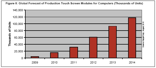 iSuppli公司預測,2014年用于電腦的觸摸屏模組全球產量將大增到1.179億個,而2010年是1580萬個。圖8所示為iSuppli公司對用于電腦觸摸屏全球產量的預測,包括臺式機、移動PC和slate以及平板電腦產品。