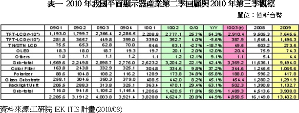 2010年第二季臺(tái)灣平面顯示器總產(chǎn)值達(dá)新臺(tái)幣4,624.7億元,比前一季成長(zhǎng)20.8%。其中面板產(chǎn)業(yè)產(chǎn)值新臺(tái)幣3,204.2億元,比前一季成長(zhǎng)22.1%,主力為大型TFT LCD面板產(chǎn)業(yè),產(chǎn)值約新臺(tái)幣2,777.1億元;其次為中小型TFT LCD面板產(chǎn)業(yè),產(chǎn)值約新臺(tái)幣352.7億元;TN/STN面板產(chǎn)業(yè),產(chǎn)值約新臺(tái)幣53.1億元,而OLED產(chǎn)業(yè)產(chǎn)值則為新臺(tái)幣20.1億元。關(guān)鍵零組件產(chǎn)業(yè)產(chǎn)約為新臺(tái)幣1,420.5億元,比前一季成長(zhǎng)17.8%,其中彩色濾光片產(chǎn)業(yè)產(chǎn)值約新臺(tái)幣334.6億元,偏光板產(chǎn)業(yè)產(chǎn)值約新臺(tái)幣173.8億元,玻璃基板產(chǎn)業(yè)產(chǎn)值約新臺(tái)幣442億元,背光模組產(chǎn)業(yè)產(chǎn)值約新臺(tái)幣470.1億元。