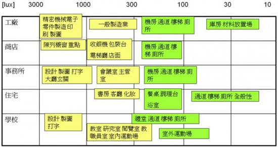 表一、各場(chǎng)所照明的基準(zhǔn)