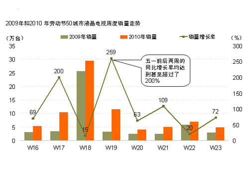 究其原因,其實與我們之前分析的上半年市場的變革不無關系。今年五一是LED電視第一次大規模上市,各廠商都試圖在這場前哨戰中拔得頭籌,均不遺余力地提前進行宣傳造勢;而諸如國美、蘇寧等幾家大型連鎖零售商也推波助瀾,比以往更早、更多地投入資源展開宣傳攻勢。事實證明,媒體攻勢是有效地。顧客提前兩周就已紛紛步入商場,而大量的新店開業活動和老店重裝慶典,加上五一本身就有的節日促銷活動,使不少消費者放心地在節前就買單回家享受擁有平板電視的生活。