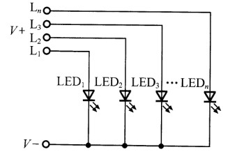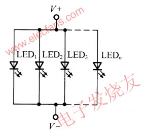 簡單并聯形式中的LED1~LEDn首尾并聯,工作時每個LED承受的電壓相等。由LED的特性可見,其屬于電流型器件,加在LED上的電壓的微小變化都將引起電流的較大變化。此外,由于受到LED制造技術的限制,即使是同一批次的LED,其性能上的差異也是固有的,因此LED1~LEDn工作時,誰過每個LED的電流是不相等的。由此可見,每個LED電流分配的不均可能使電流過大的LED壽命銳減,甚至燒壞。這種連接方式雖然較為簡單。但是可靠性并不高,特別是對于LED數量較多情況下的應用就更容易造成使用的故障。