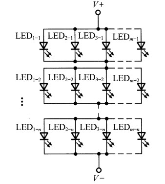 若干個LED先并后串的混聯形式如圖6所示。由于LED1-n~LEDm-n先并聯連接,提高了每組LED故障下的可靠性,但是由此一來每組并聯LED的均流問題就至關重要。為此,可以通過配對挑選,將工作電壓和電流盡量相同的LED作為并聯的一組,或者給每個LED串接小的均流電阻來解決。這種混聯形式具有的其他特點和存在的問題,與先串后并連接形式相類似。