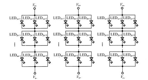 交叉陣列形式主要是為了提高LED工作的可靠性,降低故障率。主要構成形式是:每串以3個LED為一組,分別接入驅動器輸出的Va、Vb、Vc輸出端。當一串中的3個LED都正常時,3個LED同時發光;一旦其中一個或兩個LED失效開路時,可以保證至少有一個LED正常工作。這樣一來就能夠大大地提高每組LED發光的可靠性,也就能夠提高整個LED發光的總體可靠性。