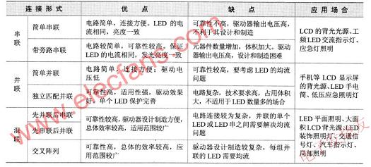 不同的連接形式具有各自不同的特點,并且對驅動器的要求也不相同,特別是在單個LED發生故障時電路工作的情況、整體發光的可靠性、保證整體LED盡量能夠繼續工作的能力、減少總體LED的失效率等就顯得尤為重要。表1給出了采用不同連接形式時的相關情況的比較。