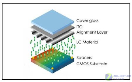 LCOS面板的結構有些類似TFTLCD,一樣是在上下二層基板中間撒布Spacer以加以隔絕后,再填充液晶于基板間形成光閥,藉由電路的開關以推動液晶分子的旋轉,以決定畫面的明與暗。LCOS面板的上基板是ITO導電玻璃,下基板是則矽晶圓CMOS基板,LCOS面板最大的特色在于下基板的材質是單晶矽,因此擁有良好的電子移動率,而且單晶矽可形成較細的線路,因此與現有的HTPSLCD及DLP投影面板相較,LCOS是比較容易達成高解析度的投影技術。