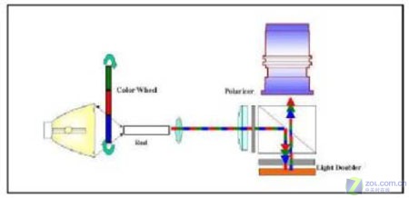 單片式ColorWheel光學引擎則是以快速旋轉的ColorSwitch將白光形成循序的紅、藍、綠光,并將三原色光與驅動程式產生的紅、藍、綠畫面,同步形成分色影像,再藉由人眼視覺暫留的特性,最后在人腦產生彩色的投影畫面。類似的技術有:Displaytech發表的FieldSequentialColor、Philip所采用的ScrollingColor-RotatingPrism架構、及JVC采用的SpatialColor–Hologram架構。[page]