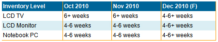 在美國,2010年第四季度零售市場銷售活躍,CCFL背光機種為主要熱銷產(chǎn)品,但該市場并未緩減所有品牌商的庫存壓力。大部分品牌商都仍面臨著LED背光液晶電視模塊居高不下的庫存問題。因此我們估計在2011年第一季度,品牌商將會趕在3月份新模塊上線前,加大促銷力度重點投放LED背光液晶電視。在中國,截止12月末,假期期間良好的銷售有效地減緩了庫存壓力,我們估計液晶電視庫存將在12月底降低到中等水平。