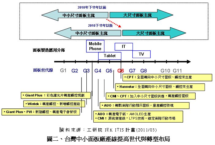 2011年是中小尺寸面板產線的轉型之重要年度,由于面板廠朝向更高世代生產大尺寸液晶面板更具有規模效益,故目前電視用面板主流切割世代廠走向7~8代,進而開啟6代以下開始大量生產中小尺寸面板逐漸成為主流。同時,走向觸控面板的生產制造結合,亦成為共同走向。