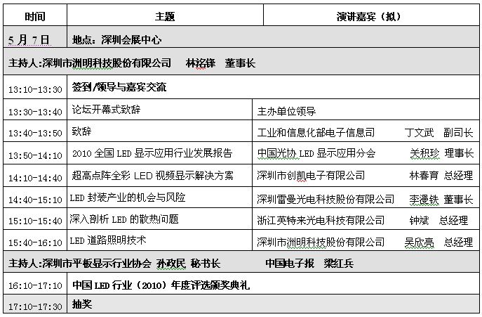 1.講座 主辦方將邀請(qǐng)國(guó)內(nèi)知名LED行業(yè)專家分析2010年中國(guó)LED產(chǎn)業(yè)發(fā)展問(wèn)題、2011年中國(guó)LED企業(yè)的總戰(zhàn)略及調(diào)整方向,預(yù)測(cè)中國(guó)LED市場(chǎng)各領(lǐng)域(原材料、設(shè)備、外延芯片、顯示屏、照明等)的投資情況分析及趨勢(shì)。