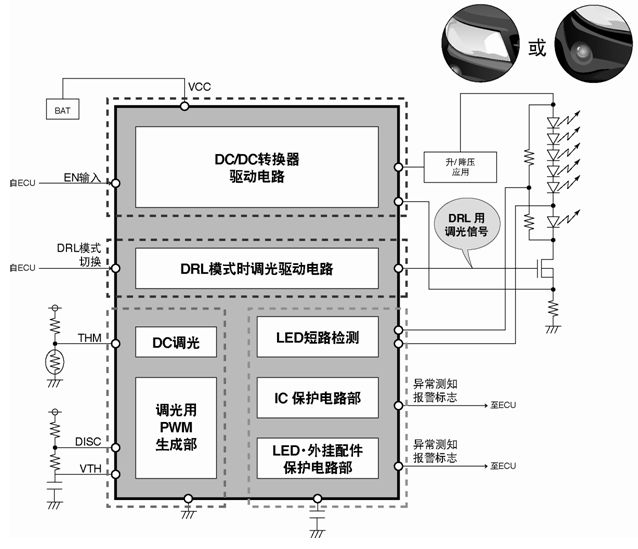 最近,汽車用前照燈正在逐漸推進LED化,以高效、長壽這一優點為背景,未來有望成為前照燈市場的重心。此外為確保車輛安全、可見度,安裝使用LED前照燈的事例會不斷增加,而未來預計LED前照燈/DRL的搭載也將面向車載用途形成標準規格系列。目前,LED前照燈只限于高級豪華車等一部分的車型上選用,對汽車制造商、前照燈制造商來說,多采用延用通用的LED驅動IC,或以分立元器件為主構成的形式,如果裝載DRL就需要另外配備與其相配的驅動電路。羅姆針對未來前照燈的LED化,率先著手開發了一款專用的IC,并推動獲得前照燈用LED驅動器所需功能的專用IC的開發。此次羅姆新開發的這種前照燈專用LED驅動IC,特別面向歐美等國先行開始普及的DRL,通過內置振蕩器電路實現微處理器控制的PWM調光。另外,為對應要求高可靠性的車載市場需求,在搭載能監測LED短路、LED開路等前照燈故障的各種保護功能,與分裝器件構成時或與通用的LED驅動IC組成時的情況相比,通過削減部件數量從而實現了可靠性的大幅提高。另外,絕對最大電壓設定為50V,對于鋰離子電池電壓波動也能非常輕松地承受的高耐壓化也得以實現。