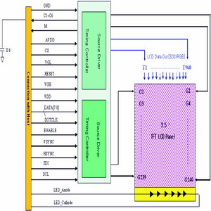 從TFT-LCD的切面結(jié)構(gòu)圖(圖1)可以看到LCD是由二層玻璃基板夾住液晶組成的,形成一個(gè)平行板電容器,通過嵌入在下玻璃基板上的TFT對(duì)這個(gè)電容器和內(nèi)置的存儲(chǔ)電容充電,維持每幅圖像所需要的電壓直到下一幅畫面更新。液晶的彩色都是透明的必須給LCD襯以白色的背光板上才能將五顏六色表達(dá)出來,而要使白色的背光板有反射就需要在四周加上白色燈光。因此在TFT-LCD的底部都組合了燈具,如CCFL或LED。