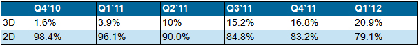 表一 Q4’10-Q1’12 2D和3D液晶電視面板占比分析