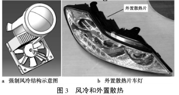 (2)強制對流提供與外界空氣熱交換。在散熱片的背面加裝風扇促使強制空氣流動。風扇加速了散熱片的熱交換的同時,流動的空氣也直接從PCB板上帶走了部分熱量。由于燈體的狹小且密封,與外界的空氣對流幾乎不可能。圖3a所示風冷結構中風扇的強制對流可以緩解散熱器中心區域與周圍環境的溫度不均勻,使燈體內部和燈體外殼的溫度盡量接近。有助于將內部的熱通過外殼和外置散熱器傳導出去。