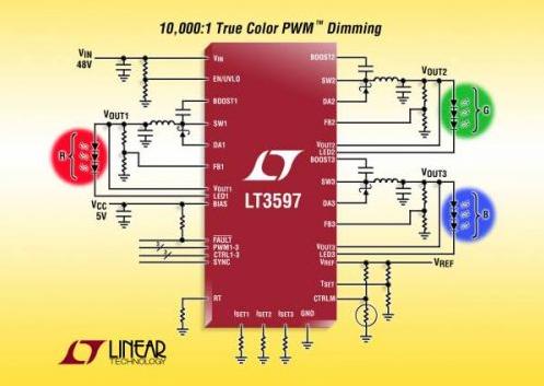 LT3597 采用 3 個(gè)獨(dú)立的 400mA、60V 內(nèi)部開關(guān),以提供降壓型恒定電流源。內(nèi)部降壓型轉(zhuǎn)換器運(yùn)用自適應(yīng)反饋環(huán)路調(diào)節(jié)輸出電壓,使其略高于所需要的 LED 電壓,以確保最高效率。如果任何一串 LED 串出現(xiàn)了開路或短路故障,那么 LT3597 就繼續(xù)調(diào)節(jié)其它 LED 串,并向 FAULT 引腳發(fā)出信號(hào)。其他特點(diǎn)包括基于節(jié)溫和 / 或 LED 溫度使 LED 電流降額以及在停機(jī)時(shí)斷接 LED。