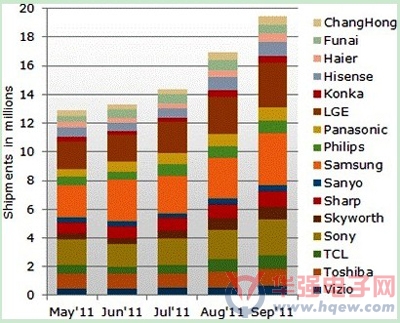 至于代工廠商情況,5月份臺灣 前七大 OEM 電視廠商總產量月成長13%,與預期相符。成本競爭和一體化業務模式使景智光電、仁寶、富士康、新奇美、TPV等OEM廠商從品牌商手中拿到了更多的訂單。2011年第三季,OEM廠商總計畫產量為1,400萬臺,季成長預估提高24%。
