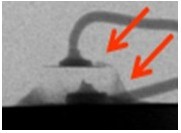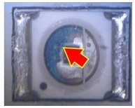 2. 變色:這類失效是指LED不點亮的狀況下,外觀顏色或膠材透明度與新品不同,用肉眼即可看出,通常在產品使用一段時間或在做完可靠度試驗后發生。一般說來,變色區域大致可區分為發生在導線架或封裝膠材兩類,若發生在導線架,通常是因為表面與環境中的化學物質發生反應,如氧化或硫化,要分辨屬于哪種需仰賴成份分析,可使用的儀器包含有EDS(Energy Dispersive X-ray Spectroscope)、XPS(X-ray Photoelectron Spectrometer)、AES(Augur Electron Spectroscope)等等。若是封裝用的膠材發生變色,則屬于高分子材料的劣化現象,如環氧樹脂易受高溫或是紫外光影響而變黃,因此白光LED多改采矽膠取代之。分析此類失效應特別留意,因膠材本身有一定的透明度,有時變色的導線架因被膠材蓋住而誤判為膠材變色,引導至錯誤的改善方向。