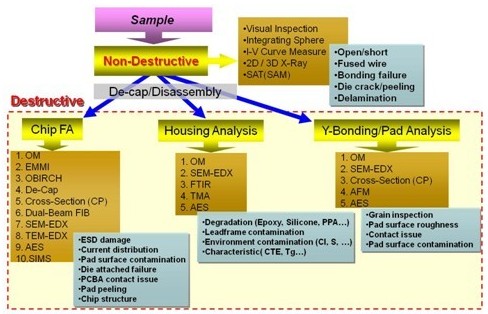 從上可知,一個LED產品的失效,起因可能來自于該產品的任何一個部份,故必須抽絲剝繭方能找到真正的失效原因。針對失效來自LED燈粒而言,因完整的LED燈粒中,LED chip本身很強壯,但包復chip的封裝材料則易遭受損傷,因此,LED燈粒的失效多可歸因于封裝材料的破壞或劣化所導致。若要充分解析這類失效,牽涉到光學、化學、材料學、電子物理學等領域的專業知識,并搭配精密的儀器與豐富的實務經驗,才能確認失效點并推導真因,進而提出改善對策。