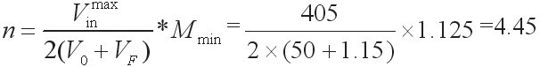 =405V,經查得變壓器輸出端整流二極管FFPF12UP2ODN壓降VF=1.15V,要求輸出電壓V0=50V則變壓器匝數比n為: