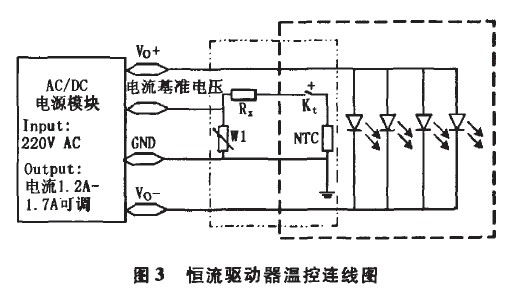 圖3為恒流電源給LED燈供電控制原理圖。電源的指標為:220V AC輸入,電流1.2一1.7A可調,電壓自適應(36~39V)。圖3中左側細虛線框中部分為控制電路,其中W1為可調電阻器;NTC為負溫度系數熱敏電阻;Kt為常開溫度繼電器,其閉合溫度為56℃,自動斷開溫度為45℃;Rx為匹配電阻。圖3右側粗虛線框中部分為LED模塊部分。溫度繼電器和熱敏電阻安裝在LED模塊上,并與模塊緊密接觸,以便將LED的溫度信息反饋給控制電路。常溫下Kt