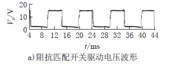 圖4a)、b)、c)為可控硅導(dǎo)通角為115°時(shí)阻抗匹配開關(guān)驅(qū)動(dòng)電壓VZ、輸入電流Iin、輸入電壓Vin的波形,電路的輸出電流為470mA,功率因數(shù)為0.78。從圖中可看出,當(dāng)可控硅導(dǎo)通瞬間,由于驅(qū)動(dòng)器輸入端有差模濾波電容導(dǎo)致輸入電流有沖擊電流尖峰,而當(dāng)輸入電流小于一定值時(shí),阻抗匹配開關(guān)開通以保證流過可控硅的電流大于其維持電流。
