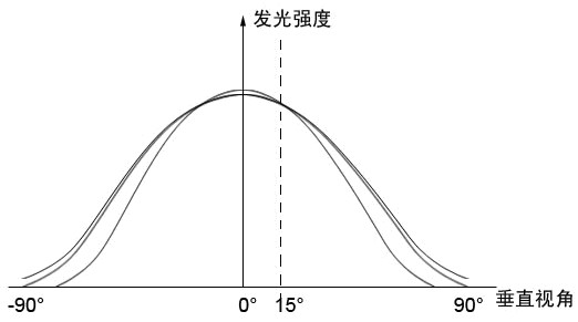 每個(gè)燈點(diǎn)在不同的角度觀看時(shí)亮度是不同的,且每個(gè)燈點(diǎn)隨著角度變化的光強(qiáng)分布曲線也不同。下圖為三顆LED燈點(diǎn)的發(fā)光強(qiáng)度隨垂直視角變化的示意圖線: