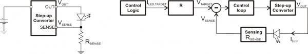 將閃光燈LED 與一個電流檢測電阻串聯,然后通過一個升壓轉換器來驅動,這是一種簡單的方法。圖1 描述了這種方法。