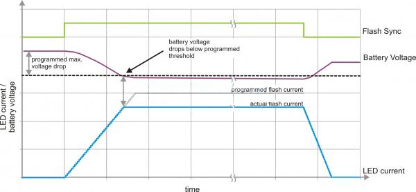 TI 擁有一種監控電池電壓的閃光燈驅動器技術。要獲得穩定的LED 電流波形并且避免過多的電池壓降,閃光燈驅動器要主動控制LED 電流上升/下降順序。在上升階段(上升斜率為25mA/12µs),要對輸入電壓進行監控。如果輸入電壓降至某個設定閾值以下,則器件即刻停止讓LED 電流進一步上升至該設定閾值,并將閃光燈電流保持在實際電平,參見圖5。