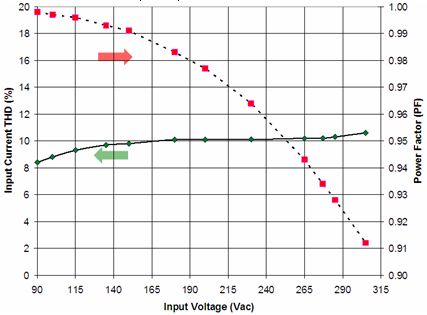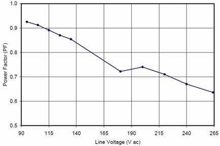 在針對商業照明的應用中使用的是寬動態范圍的精確導通時間控制器方案NCL30000。設計中采用控制器(外置FET等旁路元件)方案的原因包括易于在能效和成本之間實現折衷、能以單顆控制器支持寬功率范圍(5到30 W)、及便于優化散熱及靈活布線等。基于NCL30000構建的90到305 Vac EFD25演示板(Vout = 12 LED, 37 Vdc)測試顯示,功率因數遠高于0.9,部分輸入電壓條件下功率因數甚至高于0.95(見圖9),能效也極高。