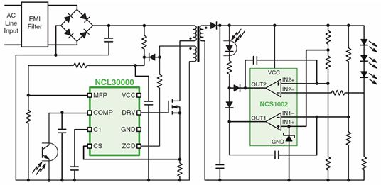 如前所述,為低功率LED照明應用選擇適合的驅動器須考慮眾多因素,這其中,有關功率因數等行業標準尤為重要。接下來,我們將以安森美半導體的幾款低功率LED通用照明驅動方案為例,探討如何在低功率照明應用中提供高功率因數。