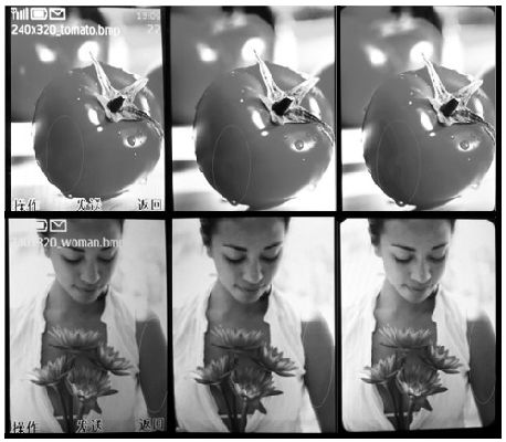 為了能更直觀地比較16bit、18bit 和24bit 的顯示效果差異,特地做了不同位深的手機顯示效果對比,從左到右分別為1,600 萬色、26 萬色和65,000色,如圖6 所示:在西紅柿的高光部分1,600 萬色色彩過渡平滑、自然,看不到不均勻的顯示,26 萬色的顯示效果稍遜,而65,000 色能明顯看出不均勻的顯示。