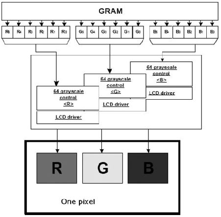 通過嚴格控制和改變液晶上所施加的電壓,每種子像素呈現(xiàn)不同的灰階。在結(jié)合了這三種子像素后,可以得到一個可以顯示不同顏色的顯示屏。
