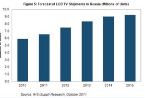 據(jù)IHS iSuppli公司的電視研究報告,隨著青睞先進(jìn)電視技術(shù)的中產(chǎn)階級不斷壯大,今年俄羅斯液晶電視出貨量預(yù)計強勁增長10%。俄羅斯屬于所謂的金磚國家(BRIC),是一個重要市場。