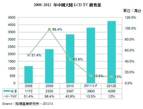 隨著2011年接近漸近尾聲,中國大陸LCD TV年銷售量預(yù)估將成長13.5%,但與2009年的98.4%和2010年的43.9%成長率相比,已不可同日而語。