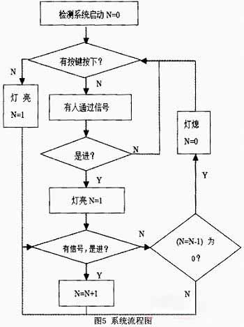 系統(tǒng)流程圖如圖5所示。其中N表示洗手間內(nèi)現(xiàn)有的人數(shù),當(dāng)檢測系統(tǒng)電源連上后,光電傳感器開始檢測,但系統(tǒng)不知道洗手間內(nèi)此時(shí)是否有人,默認(rèn)是無人,因而燈是不會(huì)亮的,這時(shí)按鍵可以用來對(duì)系統(tǒng)進(jìn)行調(diào)整。當(dāng)光強(qiáng)增大到一定值時(shí),檢測系統(tǒng)自動(dòng)停止工作。