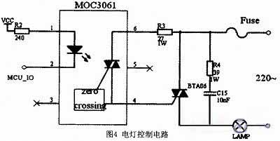 本系統(tǒng)由光電傳感器檢測洗手間內(nèi)是否有人,單片機(jī)進(jìn)行計(jì)數(shù),當(dāng)N不為零時(shí),單片機(jī)會(huì)向與MOC3061芯片引腳相連的端口輸送信號(hào),然后通過可控硅來控制燈的開、關(guān)。其中R3是雙向可控硅的門極電阻,當(dāng)可控硅靈敏度較高時(shí),門極阻抗也很高,并上R3可提高抗干擾能力。 39Ω電阻和0.01μF電容組成浪涌吸收電路,防止浪涌電壓損壞雙向可控硅。其電路圖如圖4所示。