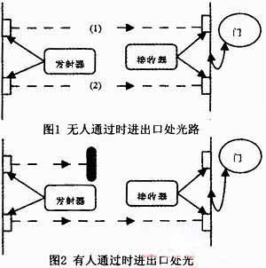 本設(shè)計(jì)的改進(jìn)之處是設(shè)計(jì)一個(gè)具有計(jì)數(shù)功能的模塊,我們可以使用對(duì)射型光電傳感器,如圖1所示在洗手間的進(jìn)口處設(shè)置兩個(gè)發(fā)射源和兩個(gè)接收源,當(dāng)有人進(jìn)或者出洗手問的門時(shí),會(huì)阻擋光線,如圖2所示,接收處就接收不到設(shè)置光源發(fā)出的光信號(hào),這時(shí)接收處的輸出端會(huì)發(fā)出一個(gè)信號(hào),計(jì)數(shù)器就可以通過此信號(hào)進(jìn)行計(jì)數(shù)。只要計(jì)數(shù)器里存儲(chǔ)數(shù)等于一時(shí),系統(tǒng)控制燈亮,大于零時(shí),該系統(tǒng)就會(huì)控制燈一直亮著,一旦為零,系統(tǒng)會(huì)控制燈延時(shí)一小段時(shí)間后自動(dòng)熄滅。由于整個(gè)系統(tǒng)初啟動(dòng)時(shí)無法判斷室內(nèi)是否有人,因而我們還會(huì)設(shè)置一個(gè)簡易開關(guān),供使用者進(jìn)行手控,且為方便使用者能在夜間看到開關(guān)的位置,我們可以采用表面具有夜光性能的材料來做按鍵。光電檢測系統(tǒng)的啟動(dòng)由光敏傳感器控制。