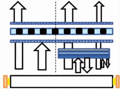為了使用盡可能少的LED而又保持良好的光學特性,本文設計的LED背光選用了1層擴散膜、2層棱鏡膜和1層雙層增亮膜(DBEF),膜材參數(shù)如表1所示。擴散膜可以改變LGP出射的光路,讓射出的光更加均勻;還可以隱藏LGP 上的dot,使從正面看不到散射點的影子,擴大視野角,提升輝度。棱鏡膜即增亮片,主要利用全反射和折射定律,將分散的光集中于一定角度范圍內出射,從而提高該范圍內的亮度。DBEF 是本文LED背光模組的關鍵膜材,可以使整個模組的亮度提升一倍,其工作原理如圖2所示。DBEF可以將不能通過下偏光片的光線反射回背光,經(jīng)背光的二次反射,部分光線又可以通過DBEF和下偏光片出射。經(jīng)過多次回收和利用,光的透過率得以大幅提高。
