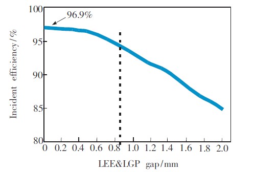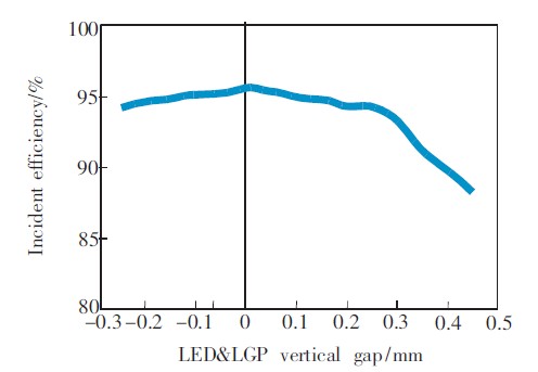 LED發(fā)光面和LGP入光面兩者之間的垂直距離通常會被忽略,但如果兩者之間的距離過大,也會嚴重影響入射效率。通過試驗發(fā)現(xiàn),兩者之間的距離在±0.2mm范圍內時,入射效率變化緩慢,且保持在95%左右,所以控制LED發(fā)光面和LGP入光面的垂直距離在±0.2mm范圍內即可。