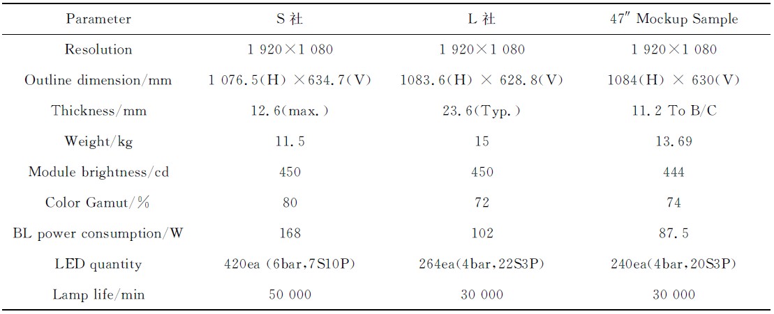 本文中設計的樣品在保證了光學性能的前提下,實現(xiàn)了低功耗的目標,達到了《平板電視能效限定值及能效等級》中規(guī)定的一級能耗,產品的厚度和色域也具有一定的優(yōu)勢。