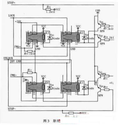 當信號D0-D5為10000時,單片機通過P10口對方位鎖定機構發出加鎖命令,控制命令經SN54LS245驅動后作用于R9和VQ1,VQ1導通后,繼電器K2的4、5導通,輸出+28 VLOCK信號控制電機進行加鎖。完全鎖定后,光電開關輸出(上)信號輸出高電平即圖3中STOP+,STOP+通過上拉電阻R16作用于R10和VQ2,VQ2導通后,繼電器K3的4、5和8、9導通,+28 V LOCK信號切斷,硬件上先停止加鎖控制,防止造成機構硬件損傷。而K3的8、9導通后,FWH+輸出+5 V電平給單片機,單片機接收信號后,終止加鎖命令,VQ1截止,K3恢復常態。解鎖過程和加鎖過程類似,在此不作贅述。