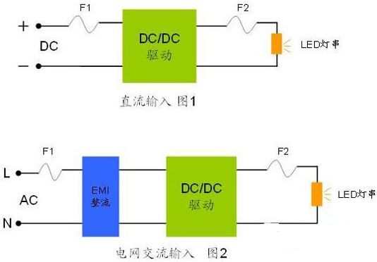 面對LED照明的眾多應(yīng)用領(lǐng)域,由于市場并沒有形成統(tǒng)一的規(guī)范,存在多種多樣的驅(qū)動解決方案,但是萬變不離其中,從過流保護的角度來看大體上根據(jù)燈體的輸入電流來可以分為:直流輸入和電網(wǎng)交流輸入兩種最基本的類型,兩種類型的主要區(qū)別在于驅(qū)動電源是否有交流轉(zhuǎn)直流的模塊。當(dāng)然市場上也有很多電阻、阻容降壓等低成本解決方案,沒有EMI整流和恒流驅(qū)動的模塊,但是由于初級端保險絲的選用要求與圖2是一致,在此歸入第二種類型。