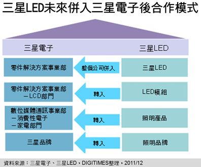 林芬卉說明,為提升三星LED事業競爭力,在三星電子(Samsung Electronics)組織改造之際,未來三星LED將納入三星電子的「零件解決方案事業部」,且LED上、中、下游產業鏈與三星電子各事業部皆有合作關系,藉由共享資源方式以發揮綜效。