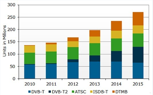 “到2015年,DVB-T和DVB-T2電視的出貨量將處于相當水平,”Gray繼續(xù)說到,“俄羅斯和印度政府轉(zhuǎn)向T2的決定給行業(yè)注入強心劑,并將推動成本下降,促進新一輪電視應(yīng)用。”