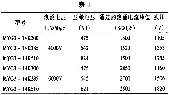 在選擇壓敏電阻器時(shí),要充分考慮電子鎮(zhèn)流器的實(shí)際工作環(huán)境因素,滿足線路的安全防護(hù)要求。表1 為部分不同型號的壓敏電阻器在不同浪涌電流峰值下的殘壓試驗(yàn)情況,從表中可以看出,選擇的壓敏電壓值越高,殘壓越高(相同峰值電流情況下) ,同一型號的壓敏電阻器經(jīng)受的峰值電流越大,殘壓也會(huì)有所加大。